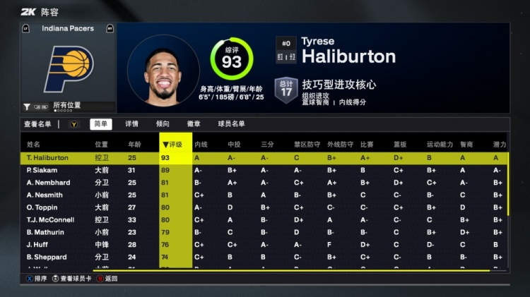 全隊有6名球員能力值80+,其中哈利伯頓93是隊內唯一90+,西亞卡姆89排第二。內姆哈德和內史密斯均是81分列第三、第四,托平和麥康納均是80。