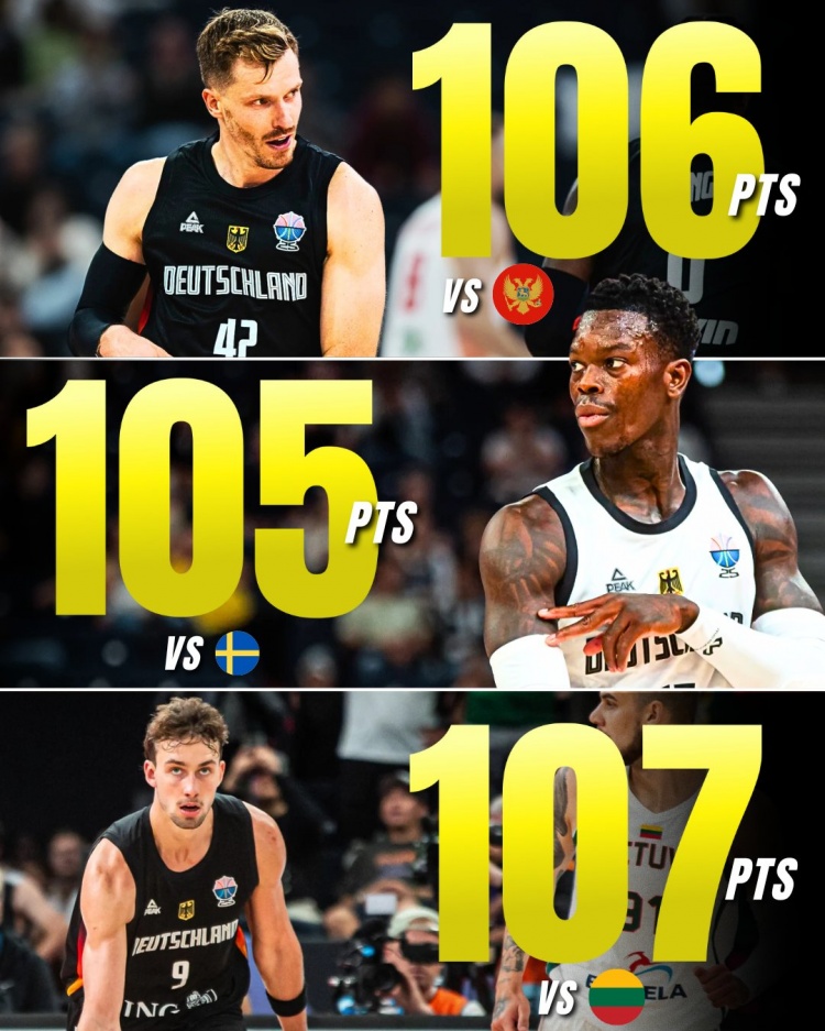 三場(chǎng)比賽德國分別是106-76擊敗黑山、105-83擊敗瑞典還有今天107-88擊敗立陶宛,三場(chǎng)比賽場(chǎng)均拿下106分,排在賽事第一。