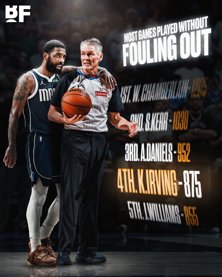 08月31日訊 今日,美媒Basketball Forever列出了一項與獨行俠后衛凱里-歐文有關(guān)的數據——歐文NBA生涯至今從未犯滿(mǎn)離場(chǎng)(包括常規賽和季后賽):