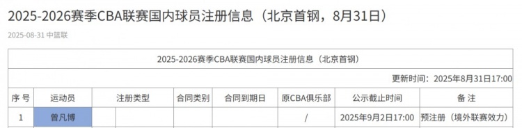 8月31日訊 CBA官網(wǎng)今天更新了國內球員注冊信息,北京男籃新增了曾凡博,狀態(tài)為預注冊,備注境外聯(lián)賽效力。
