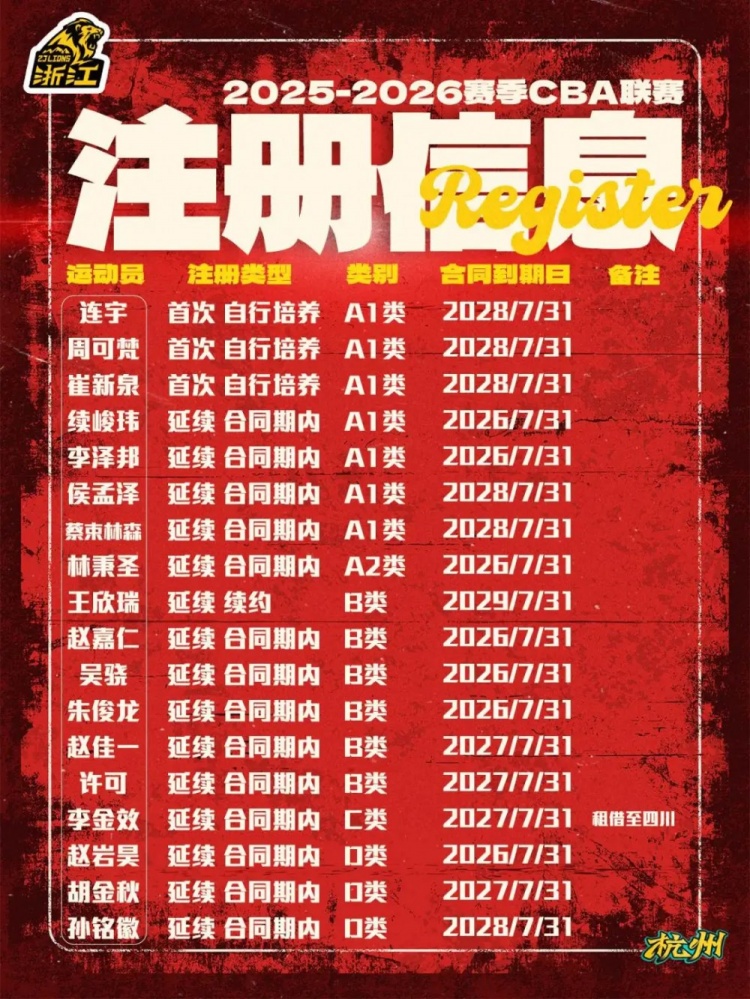 9月1日訊 浙江廣廈官宣球隊完成了2025-26賽季的國內球員注冊工作,詳情如下: