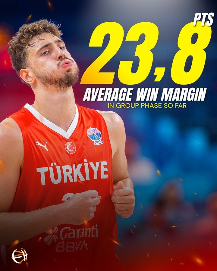 根據數據統計,這波4連勝期間,土耳其男籃場(chǎng)均贏(yíng)23.8分。
