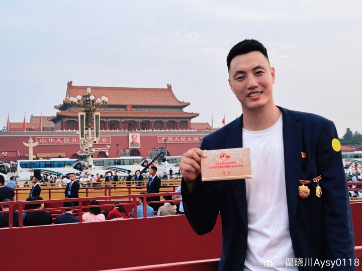 北京首鋼男籃隊長(cháng)翟曉川,戴著(zhù)北京青年榜樣獎?wù)潞褪卒搫趧?dòng)模范獎?wù)?,參加今天的閱兵儀式。