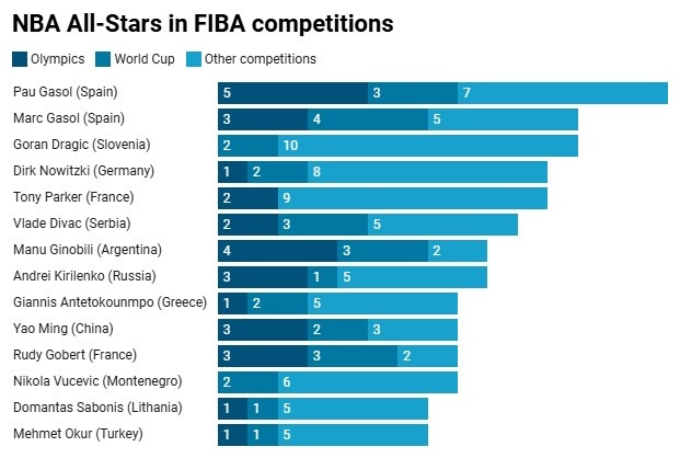 9月3日訊 2025男籃歐錦賽正在進(jìn)行中,今天,美媒HoopsHype統計了為國家隊出戰大賽次數最多的一些NBA球星,保羅-加索爾15次居首,姚明8次并列第9。