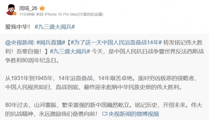 周琦觀(guān)看閱兵并轉發(fā)微博:愛(ài)我中華!