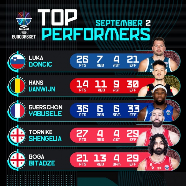 9月3日訊 男籃歐錦賽結束了又一個(gè)比賽日的爭奪,今天,歐錦賽官推曬出了昨日的球員高光表現。