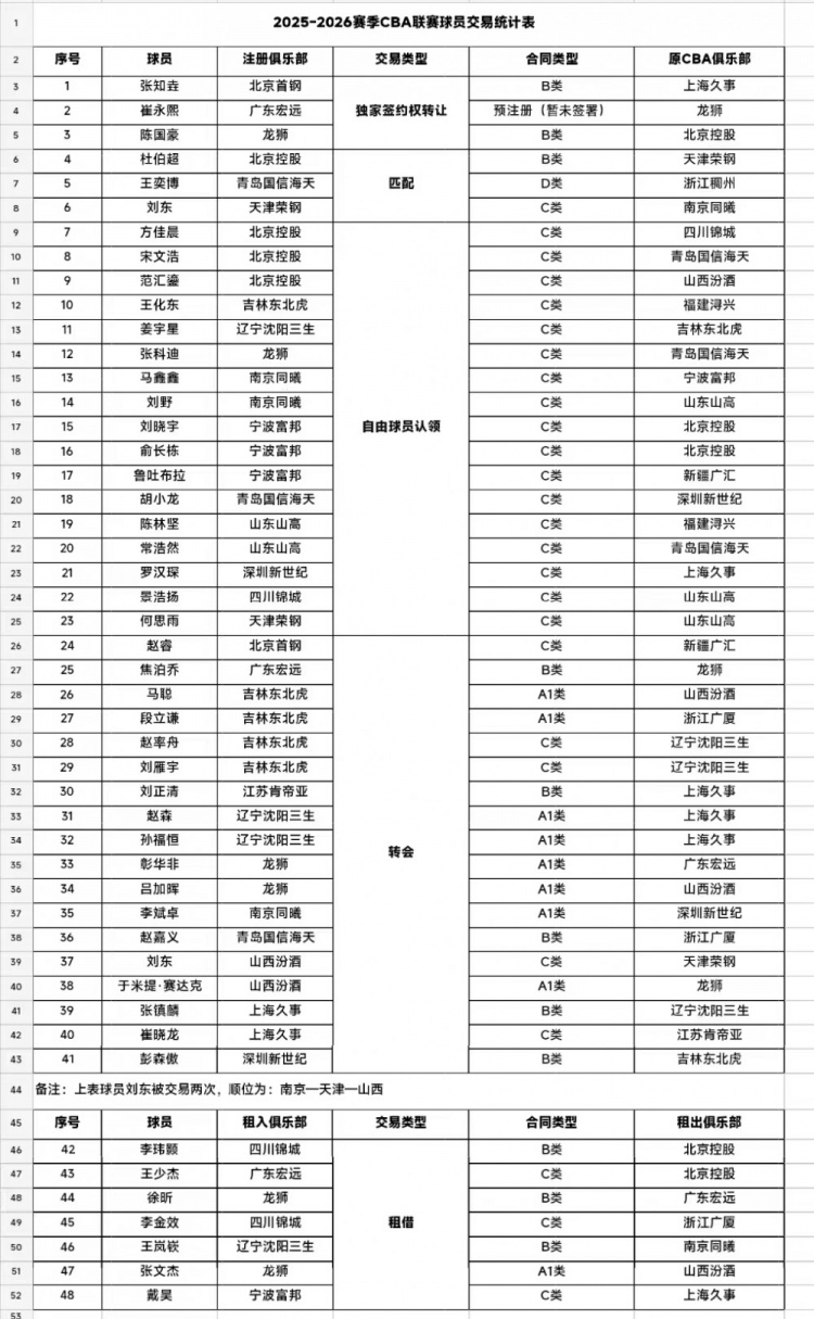 國內球員交易48人次,其中轉會(huì )18人次,自由球員認領(lǐng)17人次,匹配簽約3人次,獨家簽約權轉讓3人次,租借7人次。