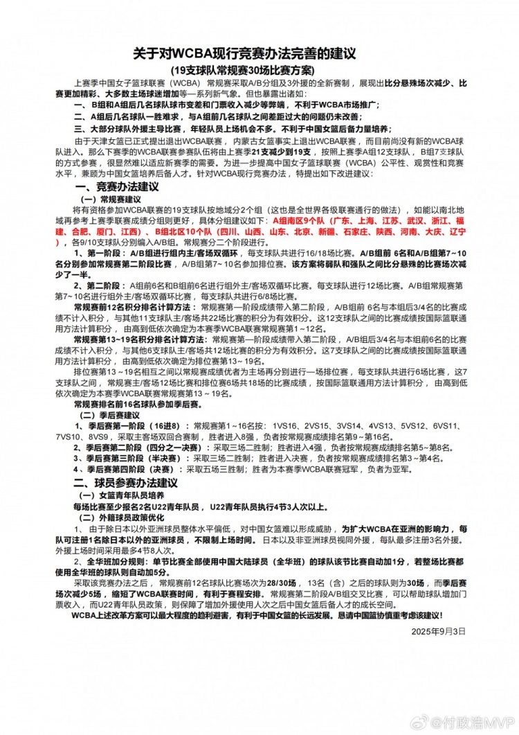 9月3日訊 今日,媒體人@付政浩更新社媒透露,WCBA正在向各俱樂(lè )部征集新賽季賽制的意見(jiàn)。