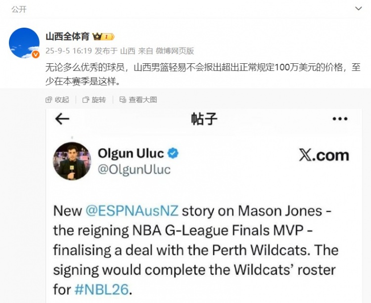 媒體人@山西全體育 轉發(fā)了Olgun Uluc的報道,并在旁邊寫(xiě)道:“無(wú)論多么優(yōu)秀的球員,山西男籃輕易不會(huì )報出超出正常規定100萬(wàn)美元的價(jià)格,至少在本賽季是這樣。 ???”