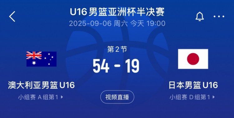 9月6日訊 U16男籃亞洲杯半決賽,澳大利亞男籃U16半場(chǎng)54-19領(lǐng)先日本男籃U16。