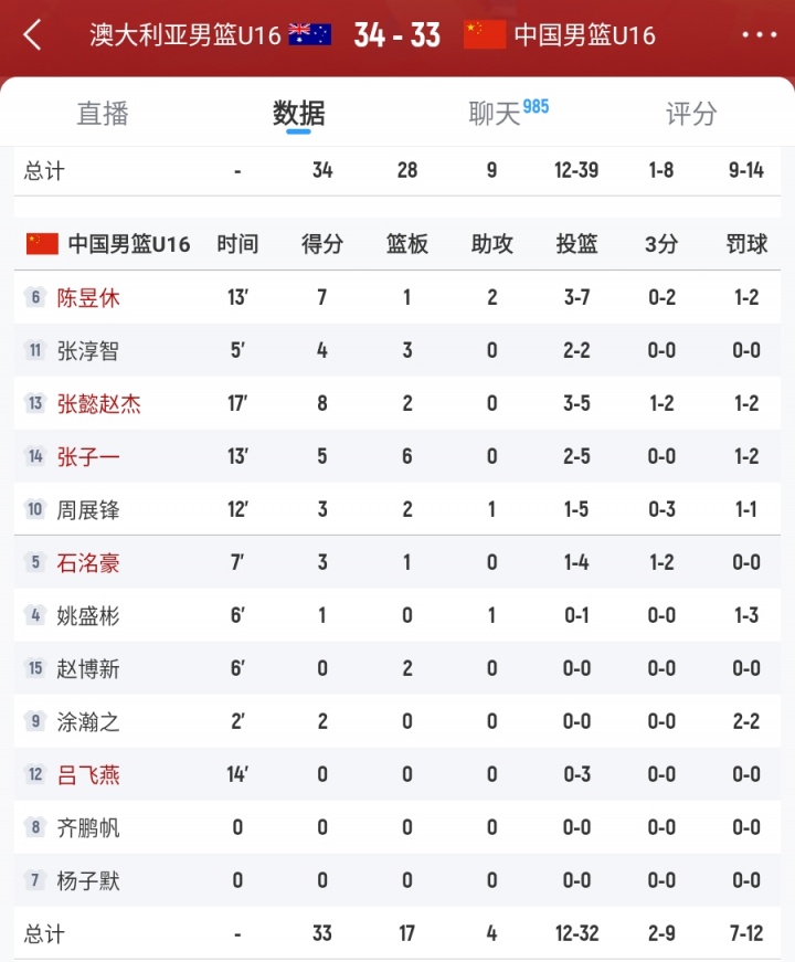 張懿趙杰8分&陳昱休7分!U16中國男籃落后澳大利亞1分進(jìn)入下半場(chǎng)