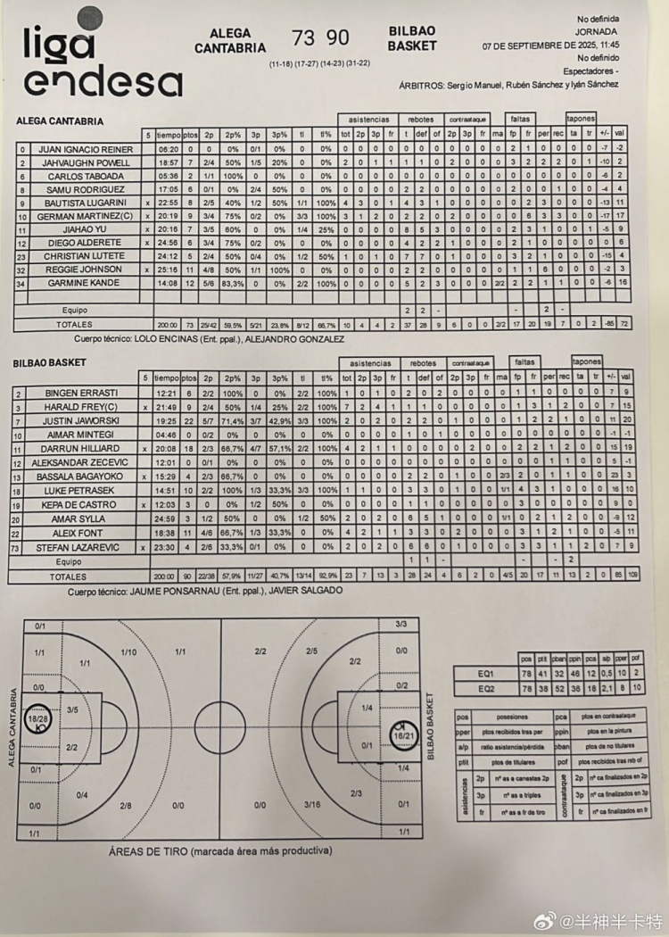 9月7日訊 今天,余嘉豪所在的Alega Cantabria隊73-90不敵母隊畢爾巴鄂。