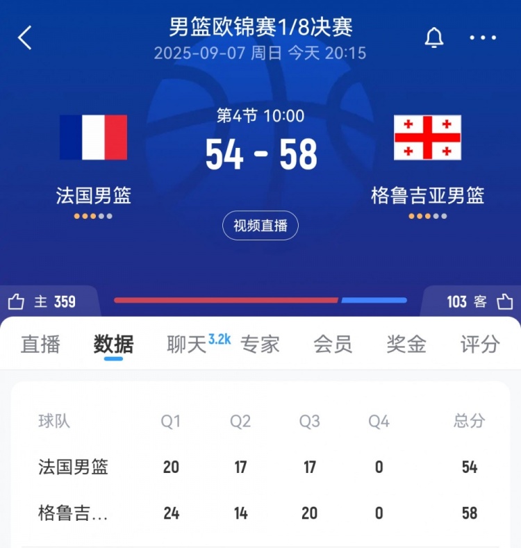 9月7日訊 男籃歐錦賽1/8決賽,格魯吉亞男籃三節打完58-54領(lǐng)先法國男籃。