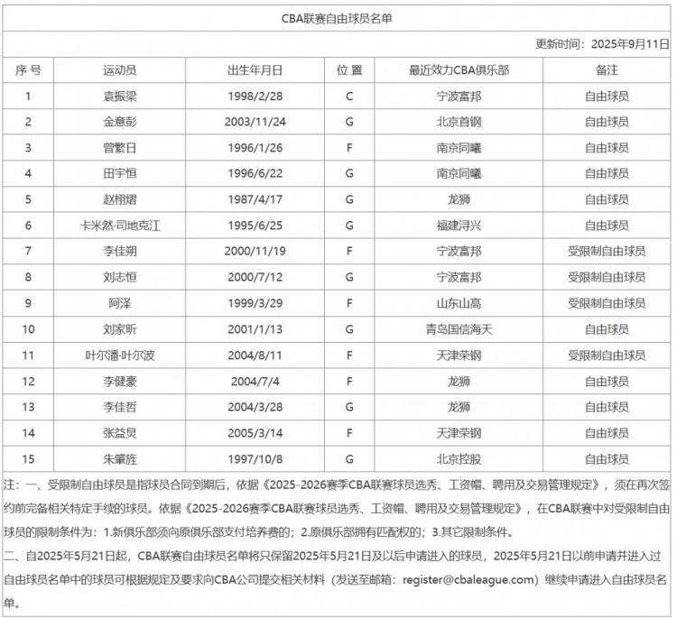 其中,前寧波隊球員袁振梁、前北京隊球員金意彭進(jìn)入自由球員名單,詳情如下圖。