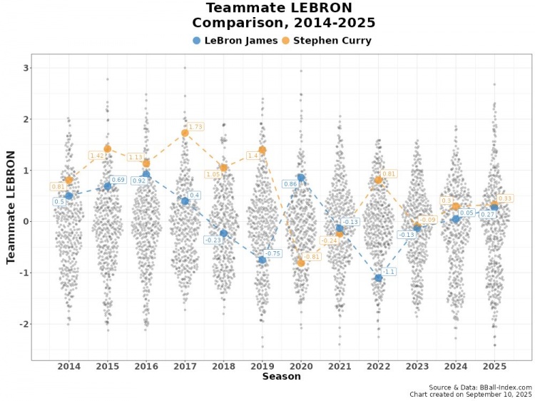 9月12日訊 近日,數據媒體BBall-Index曬圖比較了2014-2025年期間詹姆斯和庫里的隊友強度。