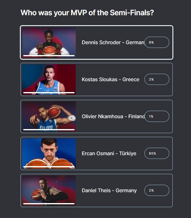 9月13日訊 男籃歐錦賽半決賽已落下帷幕,歐錦賽官方發(fā)起了半決賽MVP投票,截至目前,土耳其男籃球員奧斯馬尼以85%的票數斷檔領(lǐng)先。