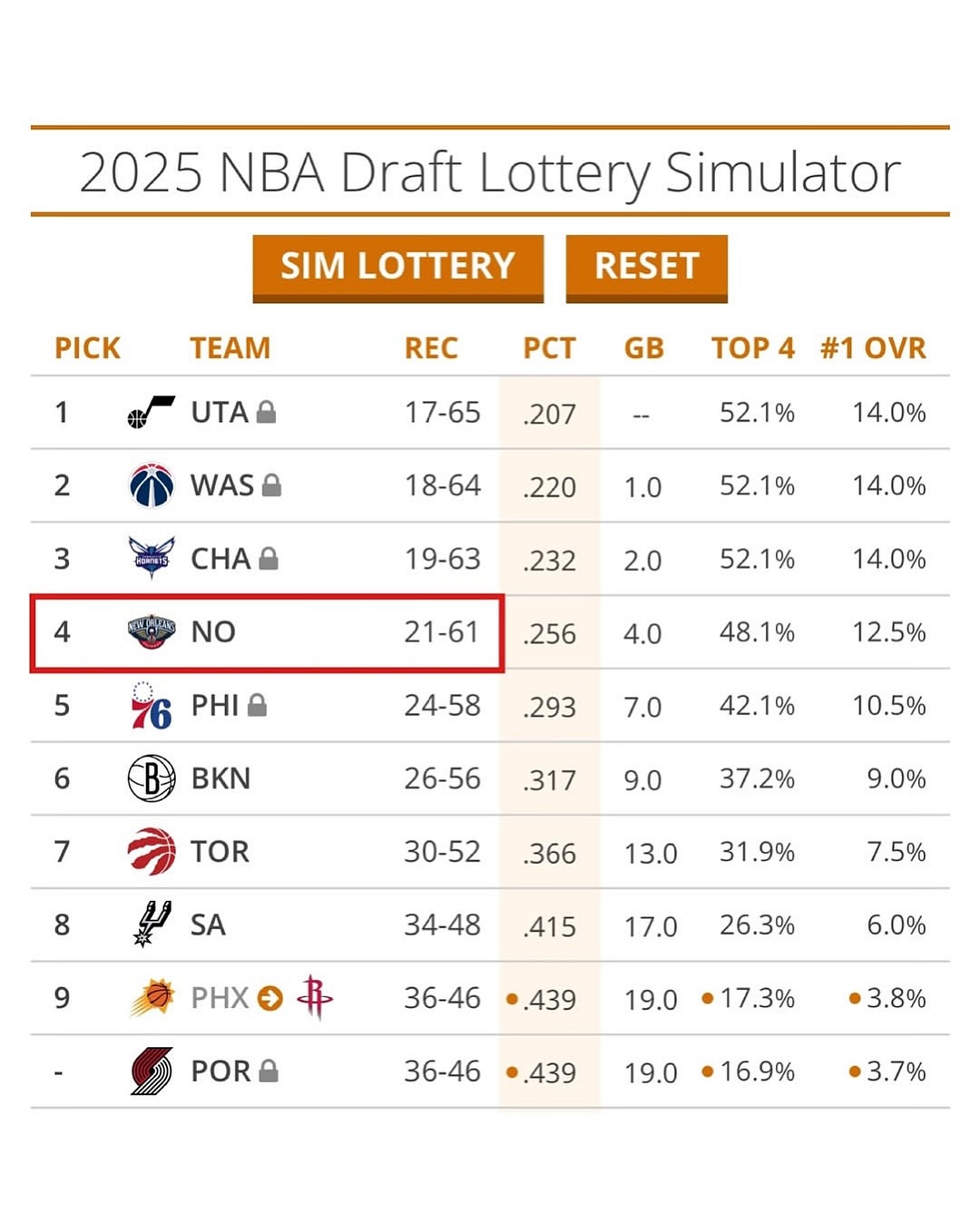 知名選秀網(wǎng)站tankathon顯示,鵜鶘擁有第四好的樂(lè )透抽簽幾率,并且擁有12.5%的狀元簽幾率。
