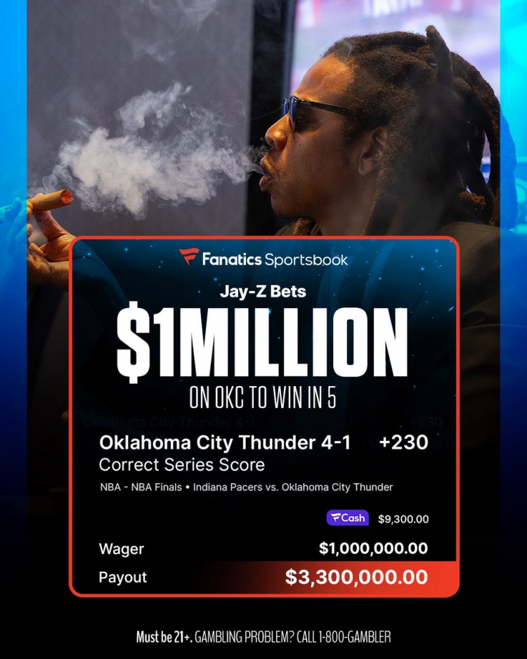 據記者Prince J. Grimes報道,說(shuō)唱大亨、著(zhù)名音樂(lè )制作人、商人Jay-Z在博彩網(wǎng)站Fanatics重金押注雷霆4:1奪冠,下注金額高達100萬(wàn)美元。