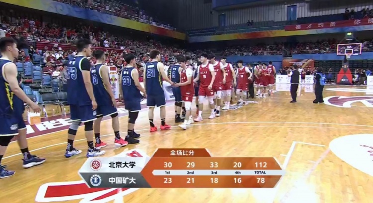 末節礦大嘗試搶攻但手感不佳,呂克古一個(gè)回合兩次三分出手都沒(méi)能命中,隨后瘋狂進(jìn)攻籃板但一個(gè)回合三次三分都沒(méi)能命中;反倒是北大雖然大部分替補陣容但打得游刃有余一直穩定大比分優(yōu)勢,比賽也早已失去懸念。最終,北京大學(xué)主場(chǎng)112-78大勝中國礦業(yè)大學(xué),以?xún)苫睾先珓夙樌麜x級半決賽。