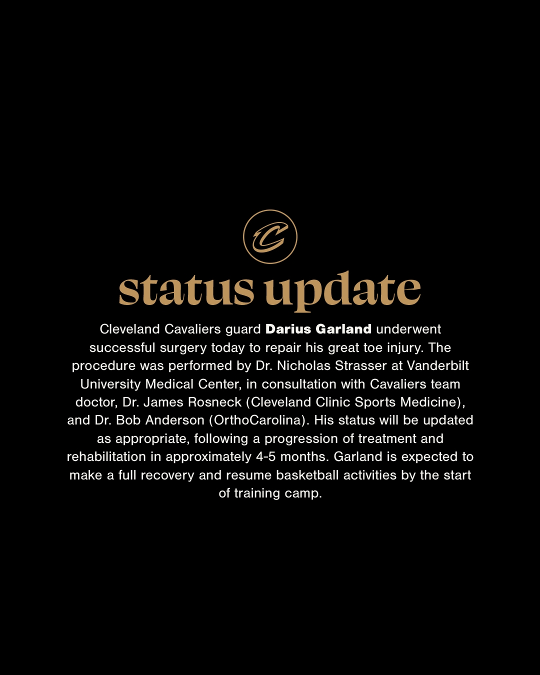 據報道,加蘭將至少休息大約4-5個(gè)月,治療和康復進(jìn)展將適時(shí)更新。加蘭有望在新賽季訓練營(yíng)開(kāi)始前恢復籃球活動(dòng)。