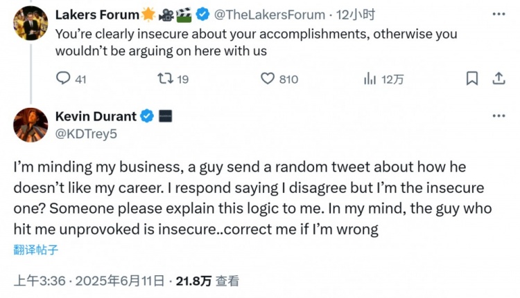 杜蘭特:“我在忙自己的事,一個(gè)家伙無(wú)端發(fā)了條推文,說(shuō)他不喜歡我的生涯。我回復說(shuō)我不同意,結果我反倒成了那個(gè)缺乏安全感的人?有沒(méi)有人能給我解釋一下這種邏輯。在我看來(lái),那個(gè)毫無(wú)緣由就攻擊我的人才是缺乏安全感的……如果我錯了請糾正我?!?/p>