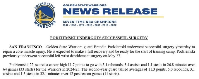 勇士隊后衛波杰姆斯基于昨日成功接受手術(shù),修復核心肌肉損傷。預計他將完全康復,并為訓練營(yíng)的開(kāi)始做好準備。此前,波杰姆斯基在5月27日成功接受了左手腕清創(chuàng )手術(shù)。