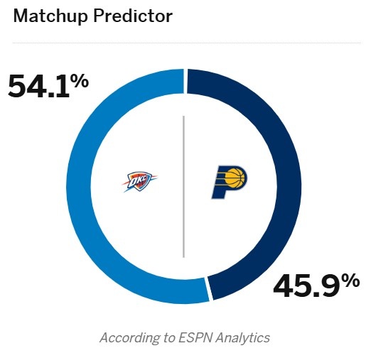 賽后,ESPN更新了總決賽G6勝率,雷霆54.1%,步行者45.9%。