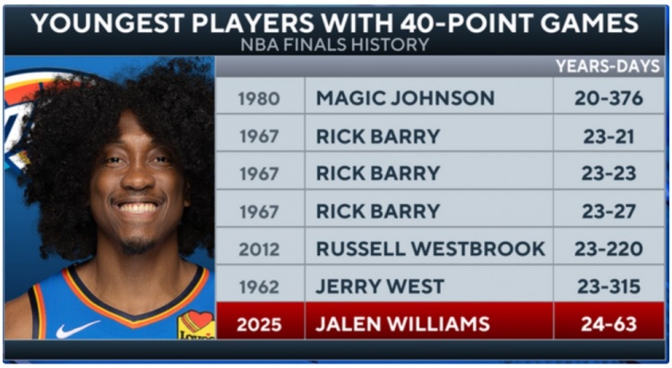 (圖為總決賽歷史單場(chǎng)得分40+最年輕球員,自上而下分別為魔術(shù)師約翰遜、里克-巴里(x3)、威少、杰里-韋斯特、杰倫-威廉姆斯)
