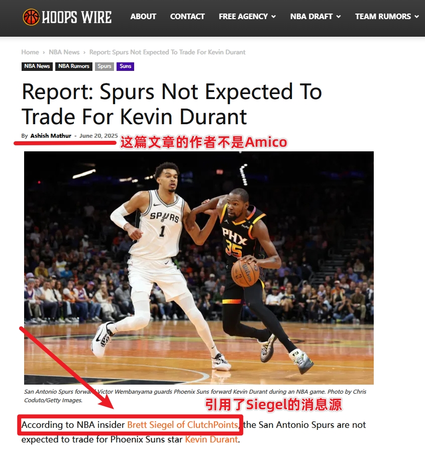 06月21日訊 今日,HoopsWire記者Sam Amico轉發(fā)文章引用了ClutchPoints記者Brett Siegel的消息源撰文表示馬刺隊現在不打算交易得到凱文-杜蘭特了。