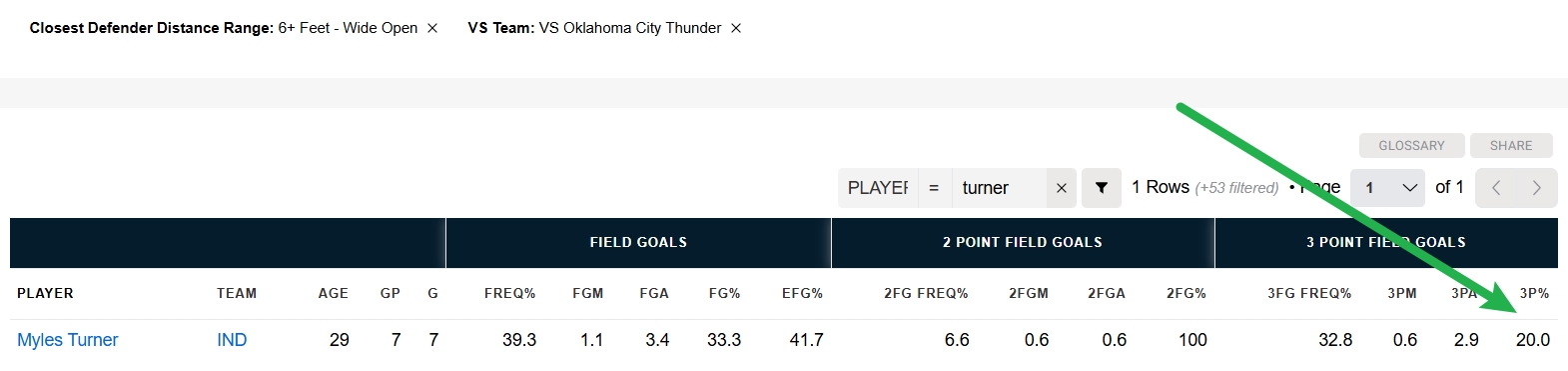 本輪系列賽,步行者中鋒特納對好機會(huì )的把握度非常低——場(chǎng)均2.9次大空位三分(6英尺范圍內沒(méi)人)的情況下,特納命中率僅有20%。