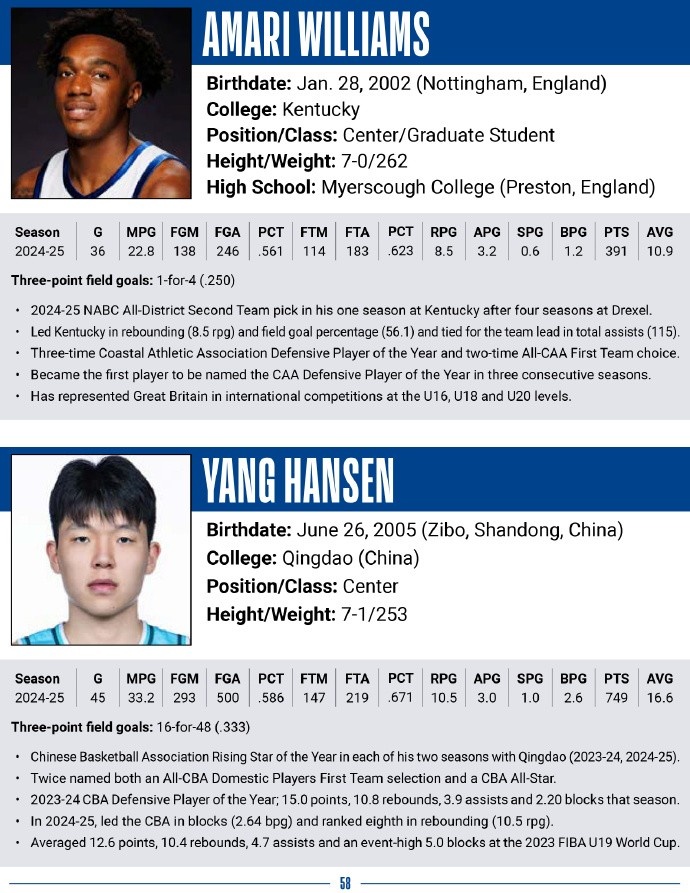 有28名球員享有每人單獨一頁(yè)資料,或許可以理解他們是更熱門(mén)的首輪球員,楊瀚森被放在第二梯隊之中,按姓氏順序與肯塔基的阿馬里-威廉姆斯分享了一頁(yè)。所以楊瀚森能進(jìn)首輪嗎?我想大家都有著(zhù)共同的期待,但因為2025年選秀的特殊性,這可能依舊是相對的小概率事件,包括幾家權威媒體最新的選秀預測榜單上,楊瀚森的排名區間都在二輪初段,這或許是更符合理性認知下的期待區間。
