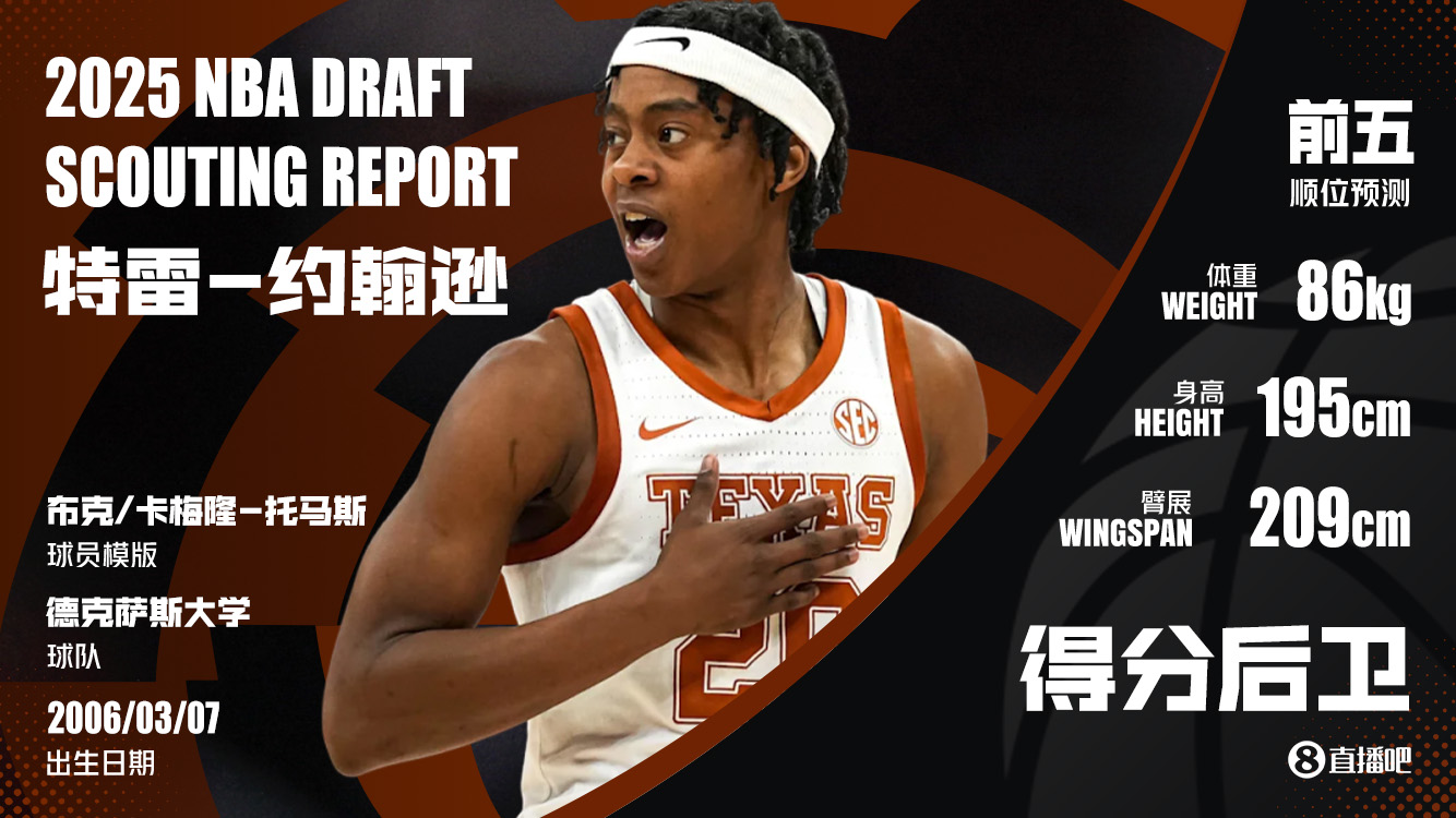 2024-25賽季,特雷-約翰遜為德克薩斯大學(xué)出戰33場(chǎng)比賽,場(chǎng)均登場(chǎng)34.7分鐘可以拿下19.9分3.1籃板2.7助攻0.9搶斷0.3蓋帽1.8失誤,投籃命中率是42.7%,三分命中率為39.7%,罰球命中率是87.1%。