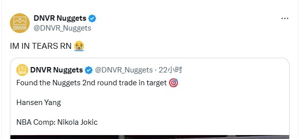 今日楊瀚森首輪第16順位被開(kāi)拓者選中,丹佛郵報轉發(fā)昨日的推特,并寫(xiě)道:“此刻我哭了??”