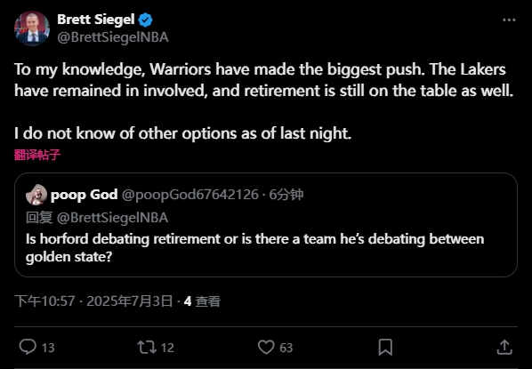 07月03日訊 今日有網(wǎng)友在推特上對ClutchPoints名記Brett Siegel提問(wèn):“霍福德是在考慮退役,還是在權衡是否加盟金州勇士?”