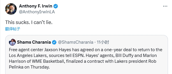 對此,湖人記者Anthony F. Irwin更新了社交媒體:“老實(shí)說(shuō)。這真的糟糕透了?!?/p>