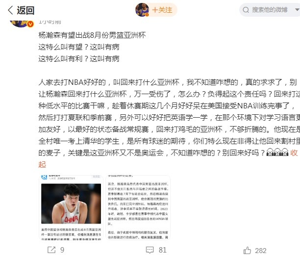 知名博主:讓楊瀚森打亞洲杯純屬有病 打完夏聯(lián)在那邊訓練不行?