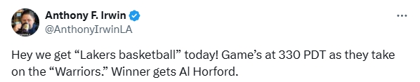 今日,湖人記者Anthony F. Irwin發(fā)推為該賽事宣傳:“嘿,今天有‘湖人式籃球’看啦!比賽將在太平洋時(shí)間下午3:30開(kāi)打,他們將對陣‘勇士’。勝者就能得到霍福德?!?/p>