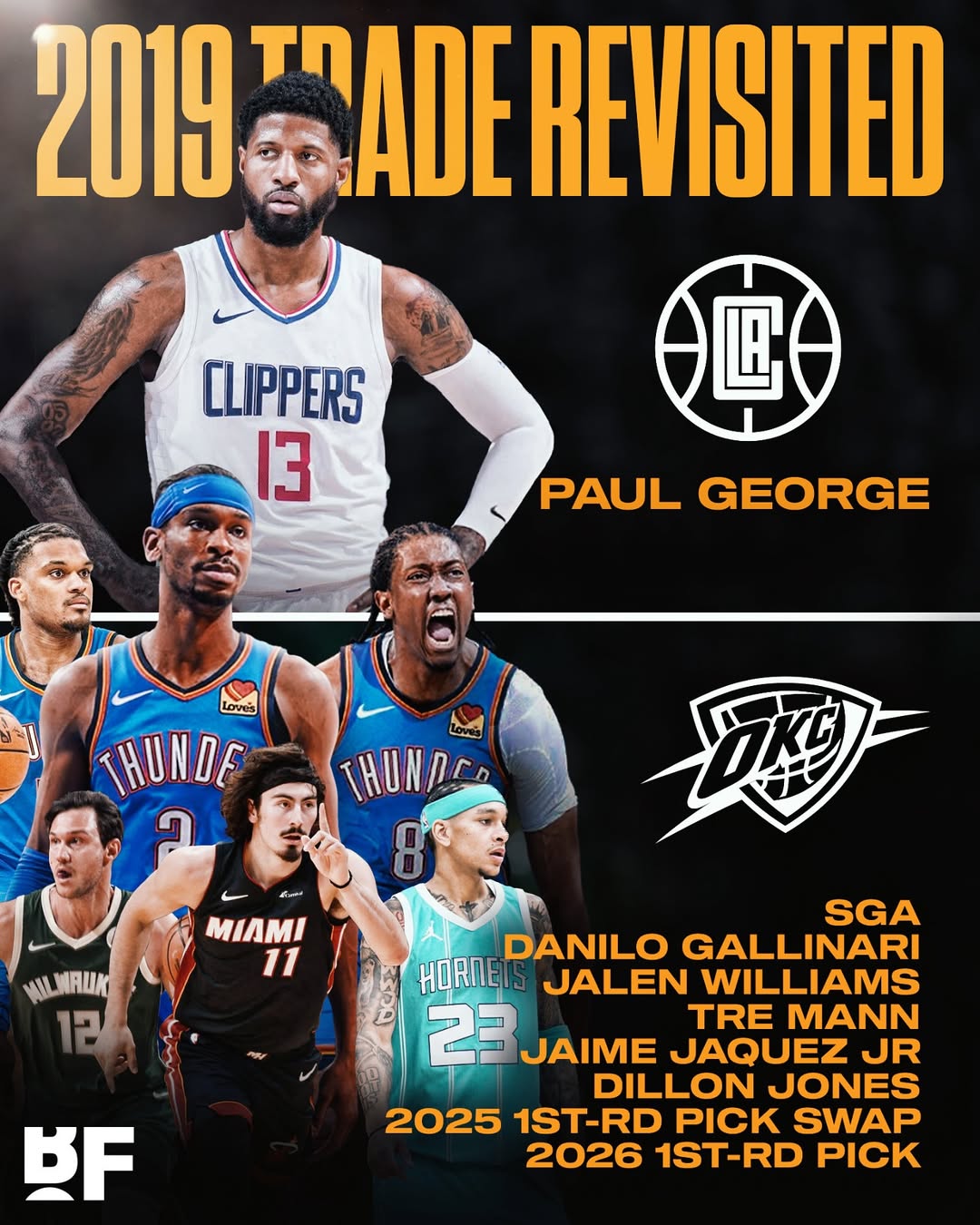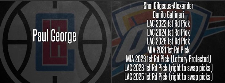 喬治當年交易詳情:快船將亞歷山大、加里納利、四個(gè)不受保護的首輪簽+一個(gè)樂(lè )透保護的首輪簽以及兩個(gè)首輪簽交換權送至雷霆。