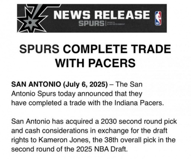 馬刺將今年的38號簽(選中了卡姆-瓊斯)送去步行者,換來(lái)一個(gè)未來(lái)次輪簽(2030年次輪簽)+部分現金。