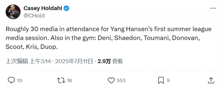 開(kāi)拓者隊記Casey Holdahl寫(xiě)道:“大約30家媒體參加了楊瀚森首次夏季聯(lián)賽媒體見(jiàn)面會(huì )。同樣在球館里的還有,阿夫迪亞、夏普、卡馬拉、克林根、亨德森、克里斯-穆雷、里斯?!?/p>