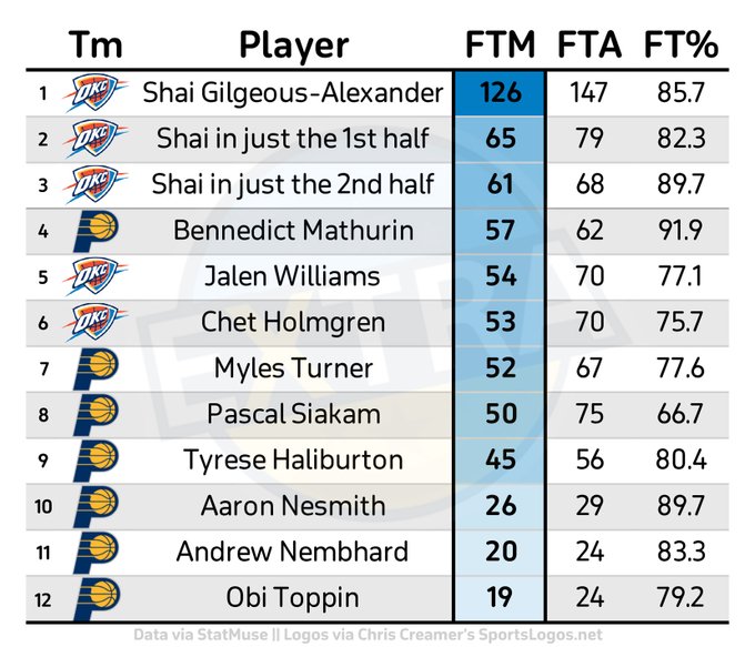 在雷霆&步行者兩隊球員中,SGA本賽季季后賽的罰球數是最多的,有147次;