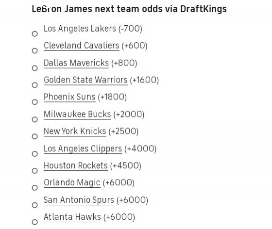 7月12日訊 近日美媒Draftkings曬出詹姆斯最新下家賠率,湖人第一,騎士排第二,獨行俠位列第三,勇士第四。