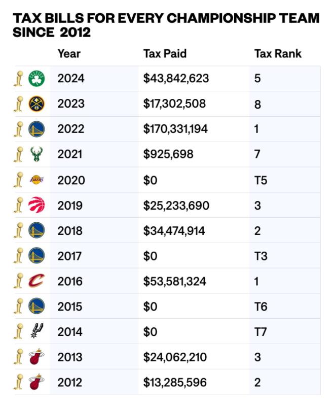 在近14年的總冠軍球隊中,沒(méi)繳納奢侈稅的球隊是20年湖人、15&17年勇士以及14年馬刺,最多的是22年勇士1.7億美元。