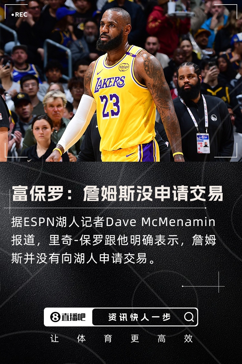 “勒布朗-詹姆斯的經(jīng)紀人里奇-保羅跟我說(shuō),有4支球隊聯(lián)系了他,表示有興趣交易得到勒布朗,”Dave McMenamin說(shuō)道,“(里奇)保羅也向我明確表示,勒布朗并沒(méi)有申請交易,(里奇)保羅甚至沒(méi)有和湖人討論過(guò)未來(lái)想要交易的可能性?!?/p>