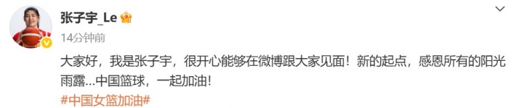 賽后,張子宇更新社媒寫(xiě)道:“大家好,我是張子宇,很開(kāi)心能夠在微博跟大家見(jiàn)面!新的起點(diǎn),感恩所有的陽(yáng)光雨露…中國籃球,一起加油!”