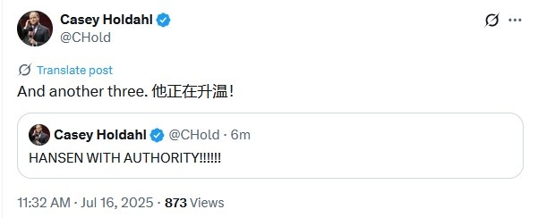 上半場(chǎng)楊瀚森轟進(jìn)2記三分,開(kāi)拓者隊記Casey Holdahl發(fā)推感嘆并大秀中文:“又來(lái)一記三分。他正在升溫!”