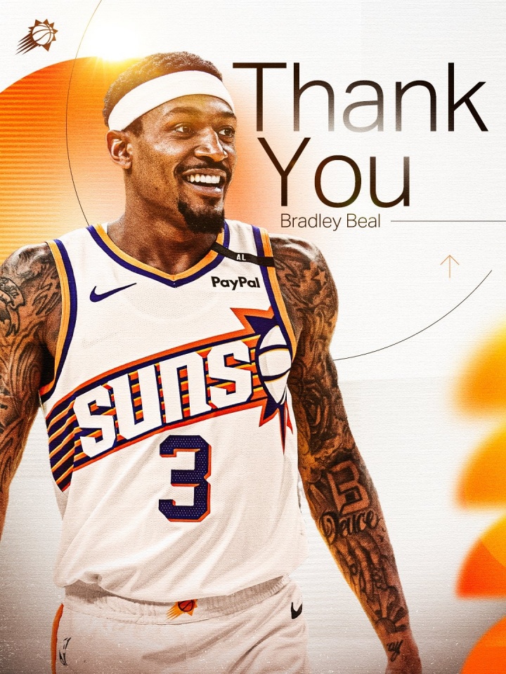 2023年6月,比爾被交易去太陽(yáng)。兩個(gè)賽季里,比爾一共為太陽(yáng)出戰了106場(chǎng)常規賽,場(chǎng)均登場(chǎng)32.7分鐘可以拿下17.6分3.9籃板4.3助攻1搶斷;季后賽,比爾代表太陽(yáng)登場(chǎng)4次,場(chǎng)均上陣18.5分鐘可以得到16.5分2.8籃板4.5助攻。