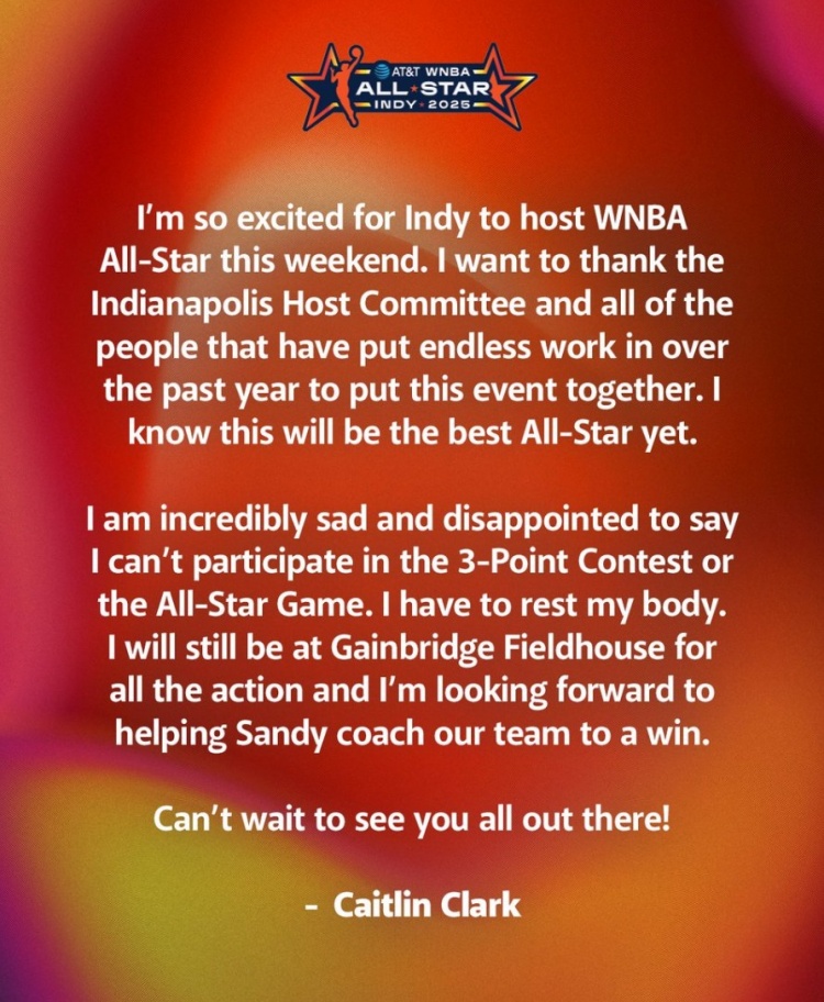 克拉克寫(xiě)道:“對于印第安納波利斯能夠舉辦本周的WNBA全明星賽,我感到非常興奮。我想要感謝印第安納波利斯的舉辦委員會(huì )以及過(guò)去一年里為舉辦這次活動(dòng)而付出無(wú)數努力的所有人。我知道這次比將會(huì )是最精彩的全明星賽。