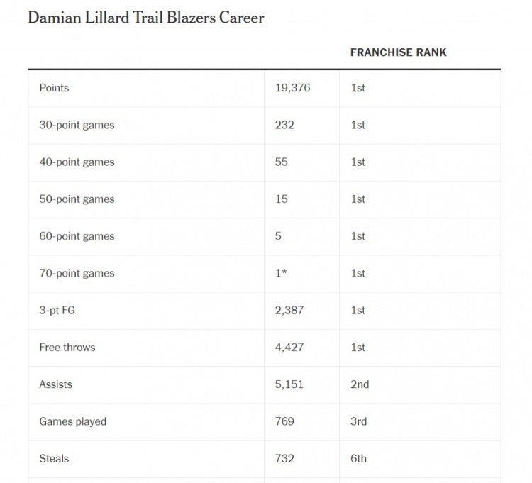 在開(kāi)拓者隊史上,利拉德無(wú)疑有重要的意義,利拉德在開(kāi)拓者得到19376分,隊史第一;232次砍下30+,55次砍下40+,15次砍下50+,5次砍下60+,1次砍下70+,2387記三分,4427記罰球,這些都是隊史第一;5151次助攻,隊史第二;出戰769場(chǎng)比賽,隊史第三;完成732次搶斷,隊史第6。