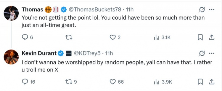 杜蘭特:我不希望被一些不認識的人崇拜,你們可以擁有那種感覺(jué)。我寧愿你們在X上黑我。